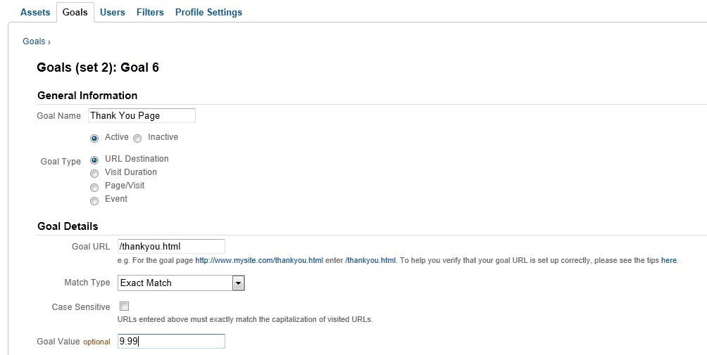 Goals can be configured around users visiting a certain page, staying on site for a target amount of time, exceeding a target number of pages in one visit, or when customized events take place. Custom Events are a bit more advanced and require some tweaks to the Google Analytics code on your site, so today lets just focus on visiting a page. The most common goal set up on a website is when users hit a Thank You or Receipt page after making a purchase: