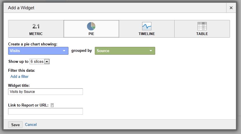 The Add Widget dialog box will ask what you want to measure and how you'd like it displayed. You can even apply filters! Right there in the dialog box! It is pretty much the very coolest.