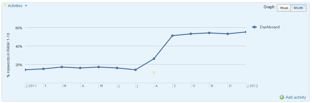 This graphic shows the increase in tracked keyword (percentage of targeted pages in Google Top 10 SERP listing). Source: Optify