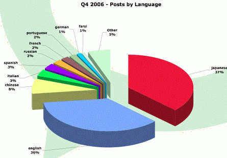 Last year Technorati released 2006 numbers showing Japanese to be dominant blogging language with English quickly shrinking.