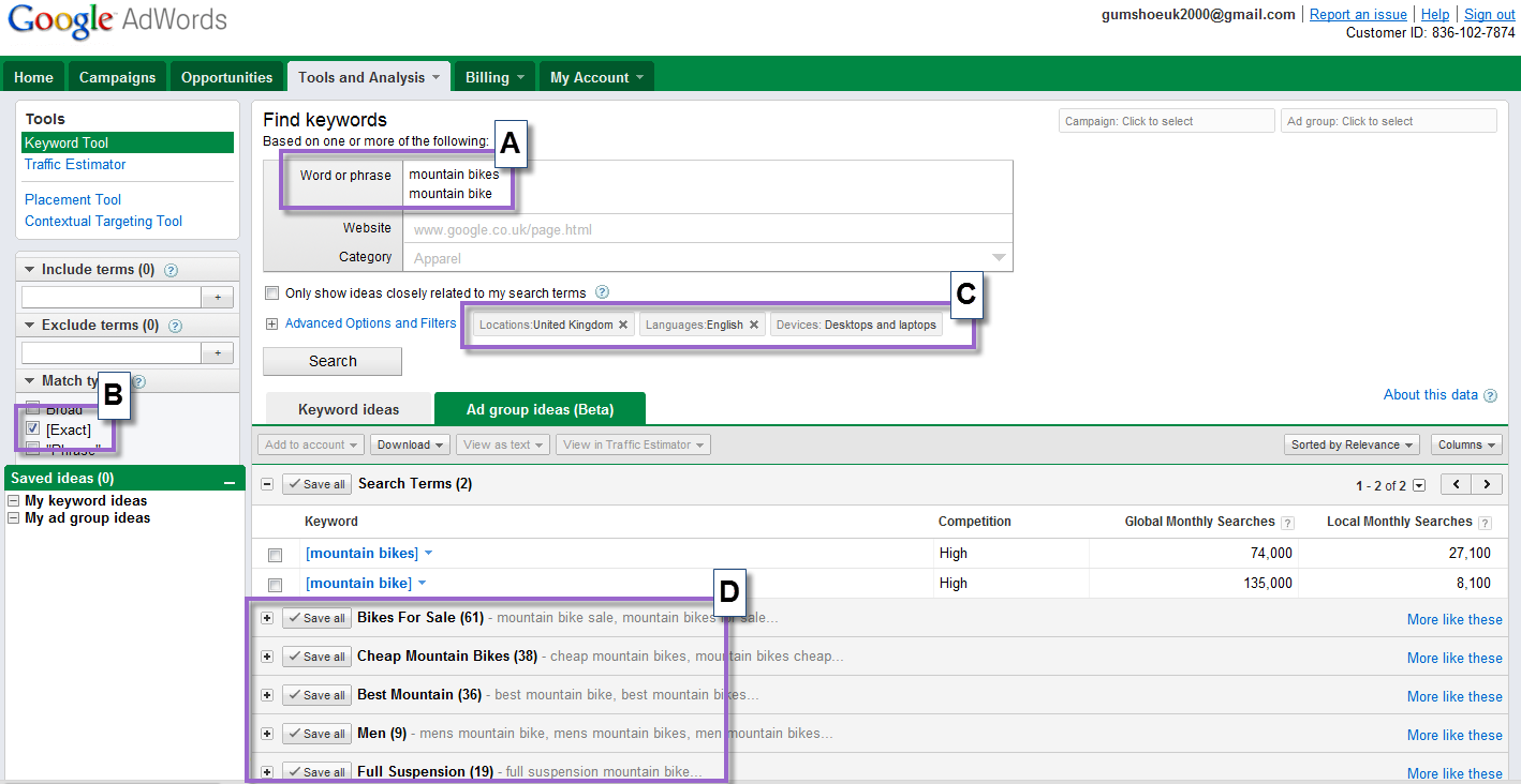 D - In this example we are going to pick the Ad Group Ideas tab as it will help us group our keywords, make them easier to filter and apply yo the right pages on your site (or convince you to create new pages!).
