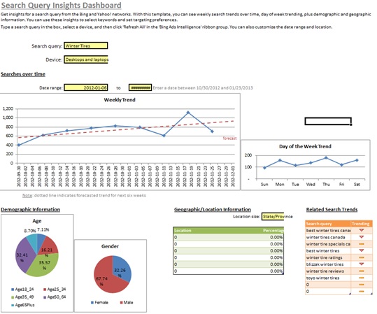 There are many cases where you can use Bing Ads Intelligence in PPC (pay per click) Campaign management but one of the best uses is the Keyword Research Template tool. Imagine you were asked to create a PPC campaign on Winter Tires. You may wish to find out the demographic information, gender breakout, volume of searches and even other search trends. By downloading Research Template, a dashboard will be created giving you insights into this keyword.