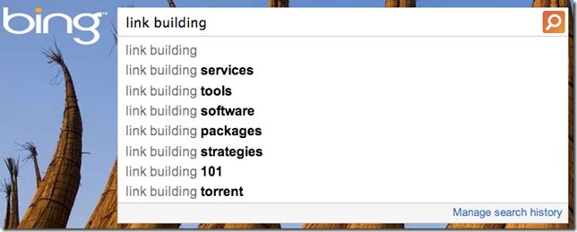 Beyond Google, you will have to use the search box to get autosuggested terms. But as you will to see, each search engine network has different ideas of suggested terms, starting with Bing.