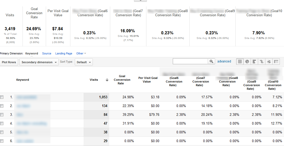 Just by looking at this chart we're starting to get ideas of which keywords are helping out your site more. Now, however, it's being ordered by visits (highest to lowest). Let's sort it two different ways, focused more on goals.