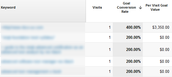 Wait... how does one get a 400% conversion rate? This is one of the reasons I mentioned above that you want to be careful which goals are put together in the same set. This top keyword has a 400% conversion rate because this one visitor completed 4 goals in the set during his visit on the site.