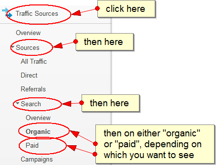 The first report you'll see on the right will be the standard "site stats" - how many visits, pageviews, time on page, etc. you had for each keyword. We're not interested in that now. Look above the graph and you'll see that this is not the only option.