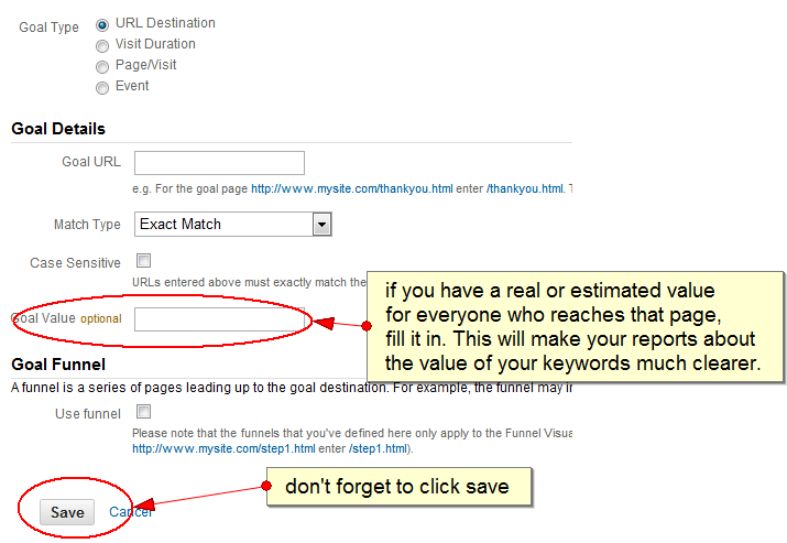 A word about Goal Value: sometimes the value is obvious. If your URL destination is the thank you page after someone has purchased your $35 e-book, so then the goal value is $35.