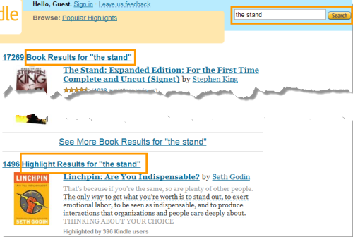 When I search popular highlights for the words the stand, Amazon returns the book The Stand " one of my favorite Stephen King books -- but also results for the highlight the stand.
