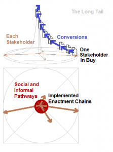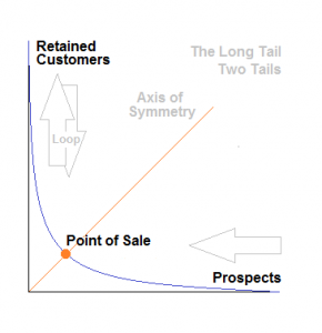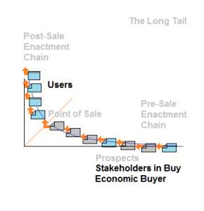 I made the point where the line and the axis of symmetry intersect the point of sale. The prospect, as in the economic buyer and the stakeholders participating in the purchase, are moved towards the point of sale from the tail of the distribution. After the purchase, the user, in the head of the distribution, moves away from the point of purchase until an upgrade brings them back to the point of sale.