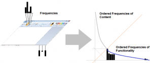As for features, they organize themselves hierarchically. A single control is part of a larger collection of controls. A feature would be that collection. Each control has a frequency of use. Each frequency has, likewise, a frequency of use. Those frequencies organize themselves along a long tail. In our representation, the head of the long tail.