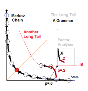 In this figure we show just one set of probabilities for one Markovian state transition. We expressed those probabilities as a factor analysis. Not all of the probabilities are expressed. I'm not sure a factor analysis would notice missing factors. Factors that account for that last 15 percent of the variance tend to be infinite and expensive to find. The two state transitions from the node with the associated probabilities branch to different long tails.
