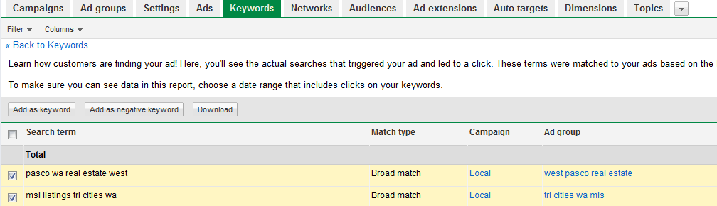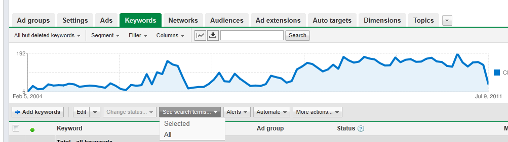 The AdWords novice who put all their relevant keywords into the campaign might think that they have this dialed-in already. However, the keywords bid on and the keywords that generated clicks to the account might be totally different animals (especially if the keywords in the account are primarily using broad match).