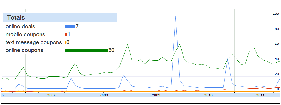 Look Marquis keywords (anyone's "one-true-keyword") earn big brag rights, but don't always have a high search volume month to month; and often include searchers whose intent isn't exactly a match to what's desired by the site owner. For instance, managers of a site selling text-message coupons might want to rank for "online deals" - even though (outside of Q4 2009), search volume for "online coupons" is usually 4 times greater.