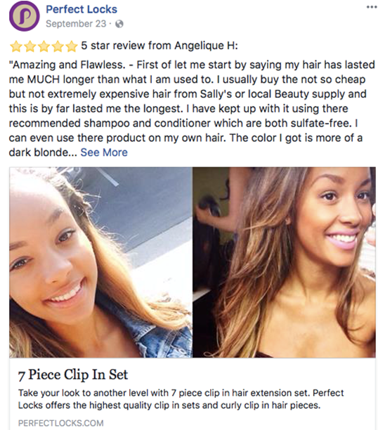 Use positive customer comments and testimonials as captions for your posts, like Perfect Locks did on Facebook.
