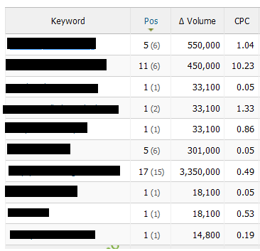 Sample screenshot from SEMrush (Pos=Position in Google/Keyword Rank):