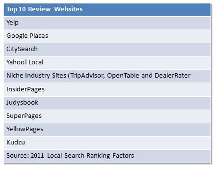 Yelp, the most popular online review website, has 61 million monthly visitors and at the end of the third quarter last year had 22 million reviews online. Yelp, Google Places, CitySearch and other review websites give local businesses, with limited marketing budgets, the opportunity to market their products and services online. For example, Yelp allows business owners to claim their listings page, upload pictures, add business details and respond to reviews. Go and claim or add your business to the top online review websites. It is a great way to get your business in front of thousands of potential customers. Below is a list of the top 10 review websites from David Nihm's 2011 Local Search Ranking Factors report.
