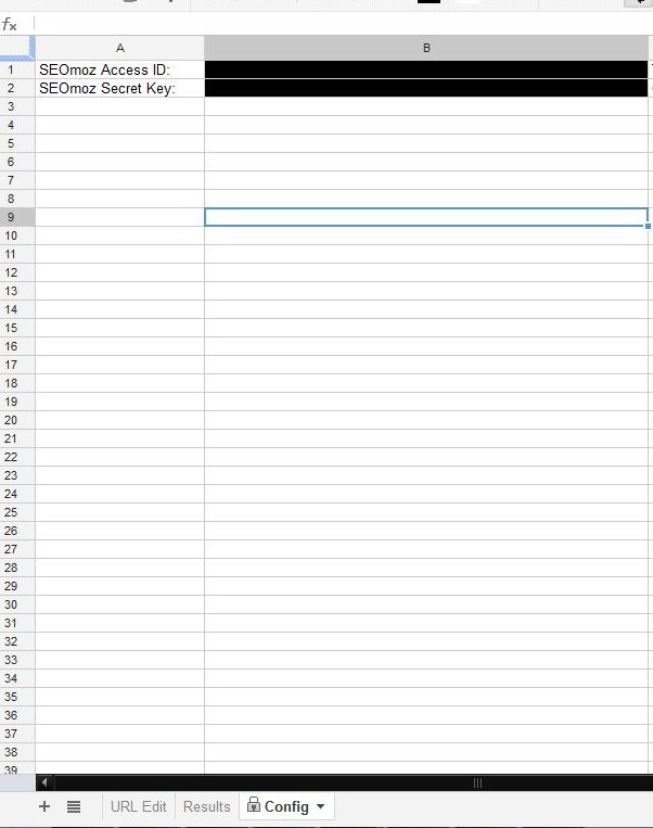 Create fields for your SEOmoz Access ID and Secret Key. They can be found at https://www.seomoz.org/api. Insert these fields into Cells B1 and B2 respectively (Seen in black).