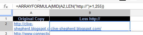 In Column B: Enter the following Array Formula to manipulate the URL to only illustrate the stripped domain.