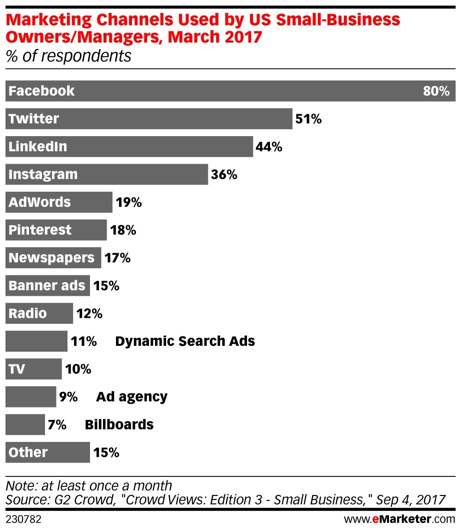 If there was any doubt about Facebook’s viability as a small business marketing channel, that doubt has been erased by the massive 80% of the survey’s participants who said they relied on Facebook for marketing. However this doesn’t necessarily prove that small business owners consider Facebook advertising a good investment. It’s important to note that the respondents may well be using Facebook’s organic features, by creating a Business page and publishing posts.