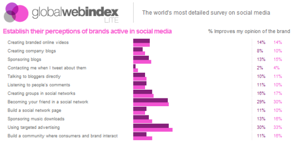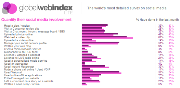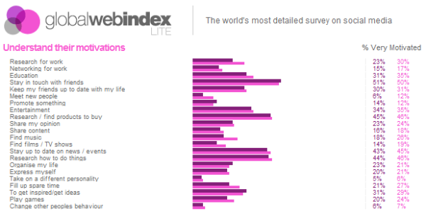 The Global Web Index gives you insights into three areas: motivations for getting online, behaviours once online, and perceptions of the way brands interact with social media.