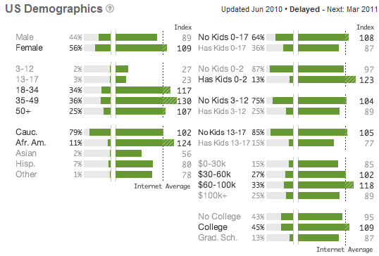 Make notes on each about Gender, Age, Family, Income and College. It is also a good idea to look at similar interests for opportunities you might not have thought of or known about. An alternative to Quantcast is Google Ad Planner.