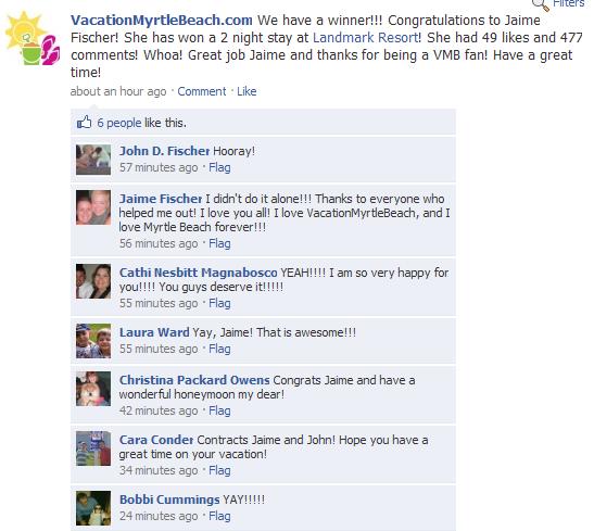One of our clients is giving away something on Facebook every week, and this week we gave away a free two night stay at a great Myrtle Beach Resort. People were so excited that one of them generated 477 comments from friends in order to win it.