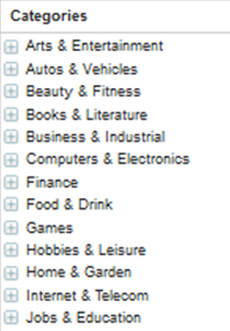 You can target people who've shown an interest in any of over 1600 interest categories. Interest categories and subcategories vary greatly, from hair care, to the Olympics, to car insurance and Bollywood movies. See below for some Interest Category examples.