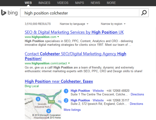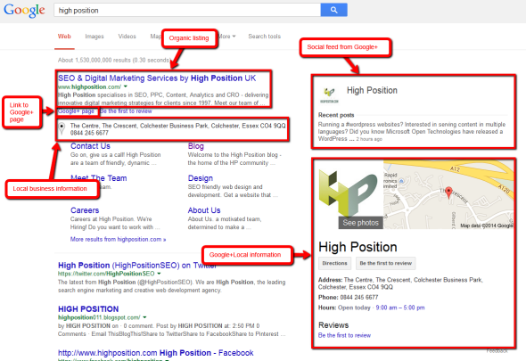 A strong local search presence can help increase brand exposure, maximise search real estate and bring customers directly to your door. Here's an example of a brand related search for High Position in which you can see how local business information helps to dominate search real estate.