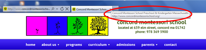 - If the location is within the business name, this can be you primary keyword. Example: Concord Montessori School is at the beginning of the title tag.