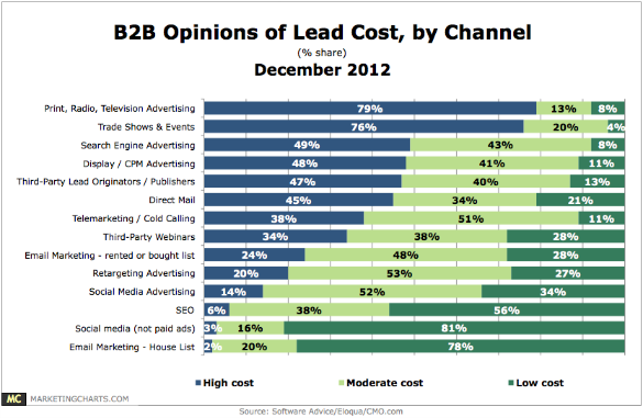 - A mere 2% of marketers rated leads generated from email marketing as 'high cost,' representing the lowest cost channel. (Software Advice Survey)