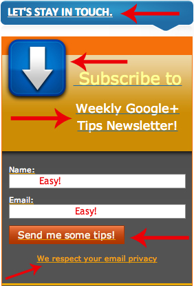 Ray of NewRayCom has become a go-to source for Google+ topics. In turn, he has developed a good email newsletter for Google+ tips. In turn, he created a compelling opt-in box for visitors to his blog to subscribe to his email list.