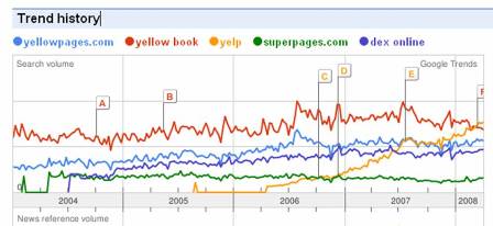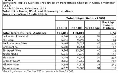 -- Yellow Book Network got the top-gaining position for the month of March 2008, with a 54 percent gain to 13.5 million visitors. This was due (at least in part) to a new partnership with addresses.com.
