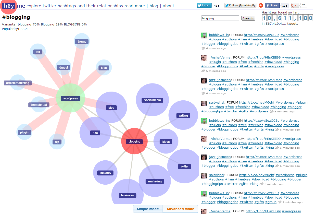A similarly simple tool, Hashtagify.me looks at hashtags to find relations between them. It shows you related hashtags as well as displaying the top influencers for that tag, charted out by influence and specialization. In simple mode, clicking a related hashtag (a blue circle) will refocus on that term; in advanced mode, clicking a blue circle will display connections for both the original term and that circle simultaneously. In either mode, the most recent related tweets are displayed on the right in real time.