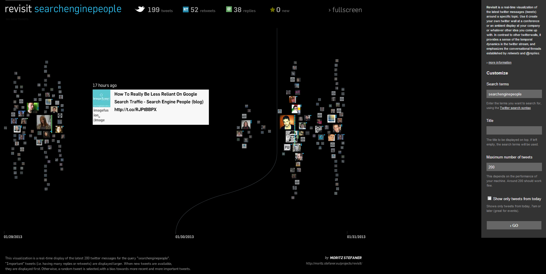 Revisit is a really beautiful visualization that displays the latest 200 tweets around a particular topic in real time. Plug in a search term (a word, a phrase, a hashtag, a @username, whatever you like), give it a fancy title, and set the number of tweets to display at once. (Just make sure you don't set it too high, or you'll need to call in computer support to fix your fried computer.) The customizable settings are really nicely suited to displays.