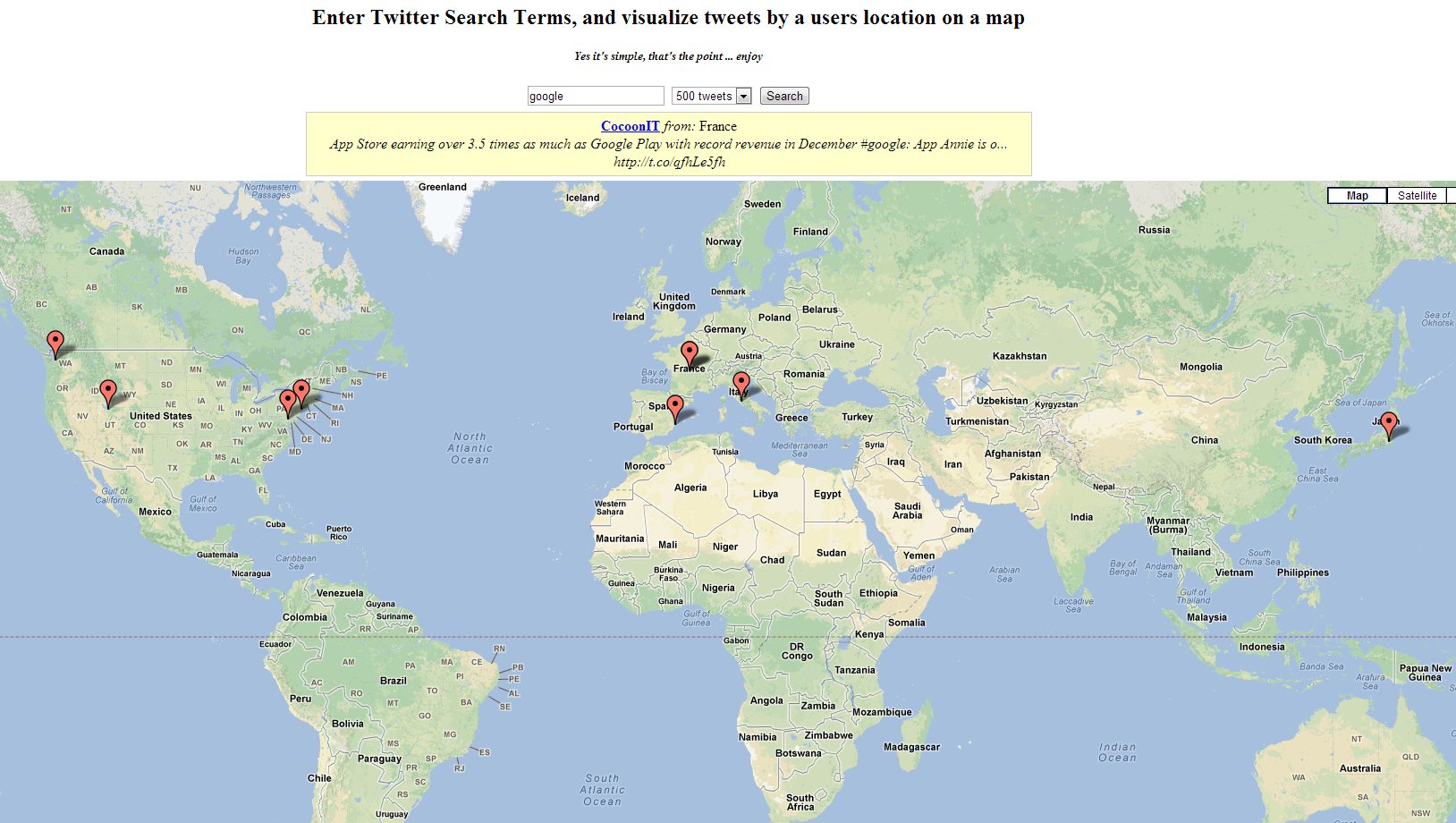 Let's start simple. True to its name, Twitter Map uses the Google Maps API to visualize tweets by their location. You can search the latest 10, 50, 100, or 500 tweets for your query. Hover over a point on the map to see the tweet. Note that this works better for trending topics than very specific terms - if a word hasn't been mentioned in the last 100 or 500 tweets, nothing will be mapped!