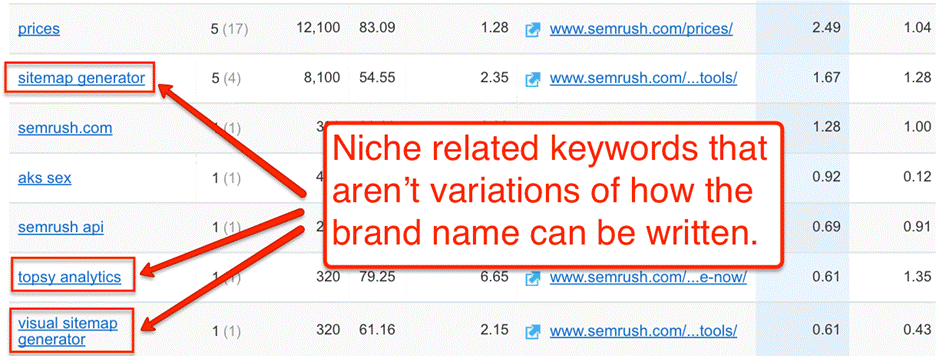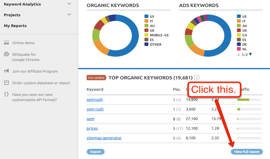 Usually, the keywords that would appear on the “Top Organic Keywords“ section on the “Overview” menu are variations of the keywords that the internet users might use when searching for a brand name. Thus, you see “semrush,” “sem rush”, and “sem.” However, if you’ll click the “View Full Report”, you should be able to see several other niche related keywords that aren’t variations of your brand name.