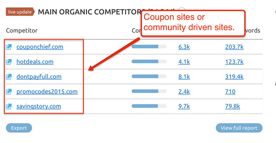 At this point, you should now be able to see several discount coupon sites on the full report of SEMRush.com.