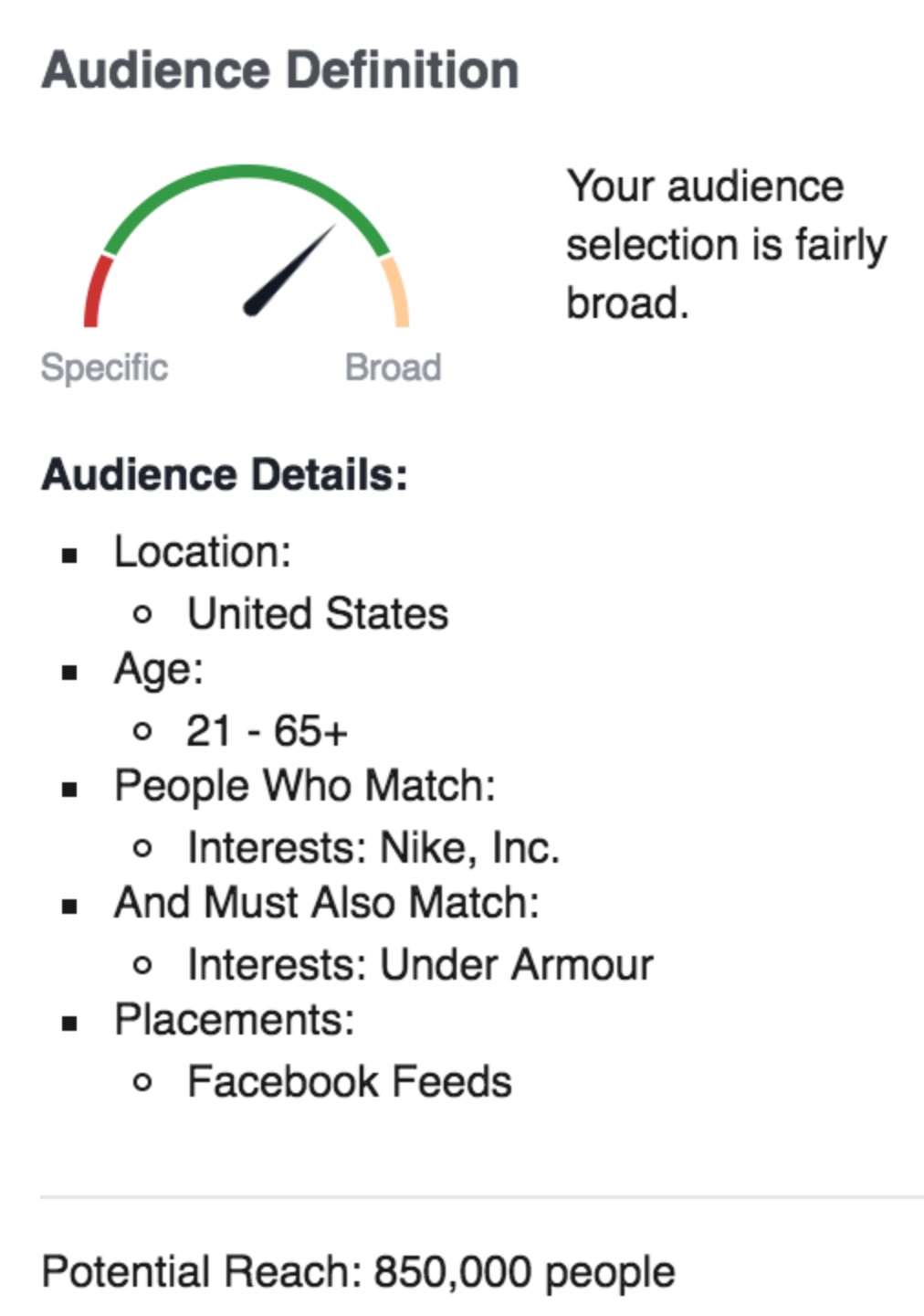 In this example, I will be targeting people who like the two biggest American shoe brands, Nike and Under Armour. To make the targeting more specific, I use the "Narrow Audience" option. Otherwise, I will be targeting all the people who like Nike OR Under Armour. That would be a huge audience. The "Narrow Audience" option changes the conditional to AND, which makes my ads way more relevant. After all, someone who likes all these brands together must be a huge shoe fan.