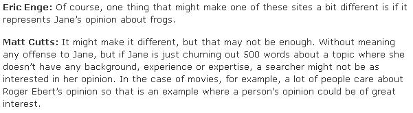 As I see it, Authorship will provide a means for Google to differentiate quality. As Matt Cutts stated in the example above, due to the reputation he has developed, people care about Robert Ebert's opinion simply because it is Robert Ebert's opinion.