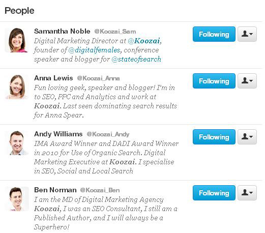 Of course, there is always a concern with social media that staff could go off the rails and start to damage your company image. I would simply suggest implementing a sensible social media policy and trusting your staff . The Koozai team have done a great job of publicising the company brand by developing their personal brands - and the fact that different team members talk about their different areas of expertise also demonstrates the breadth and depth of talent in the company.