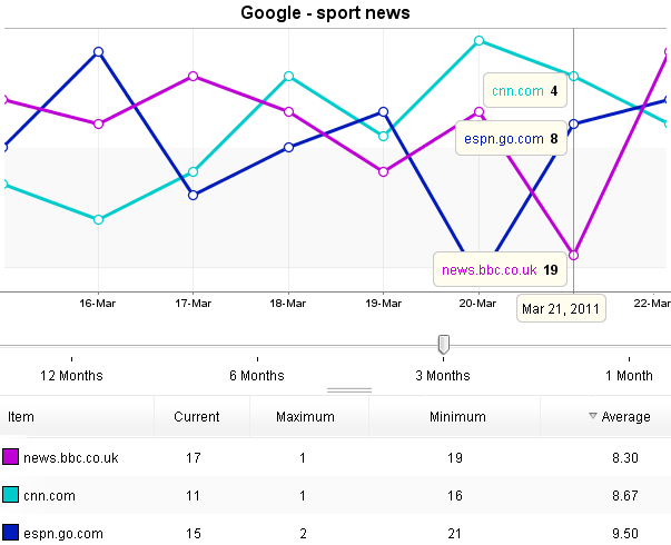 The comprehensive charts in AWR show you the evolution in time of your rankings, links and social shares in comparison with your competitors.