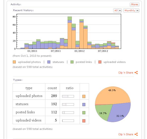 The Wolfram Alpha tool receives information from your Facebook (with your permission, of course) about your activity, friends and trends. It analyzes the data to tell you all kinds of interesting information like what you post most, what time of day you're most active, what types of friends you have, even what words you use the most!