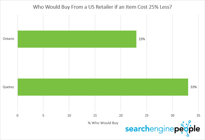 33% of Quebec residents would buy an item if it cost 25% less from a US retailer, compared to just 23% of Ontario residents.
