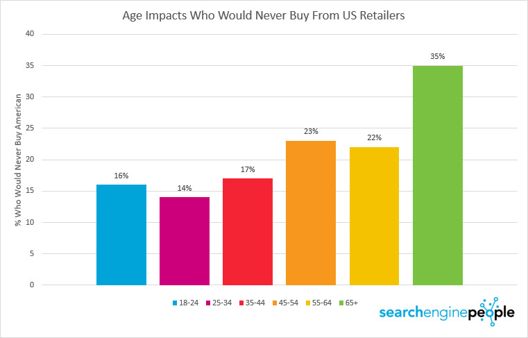 Age was a factor when it comes to who would never shop south of the border. 35% of Canadians aged 65 or older would never purchase from an American retailer.